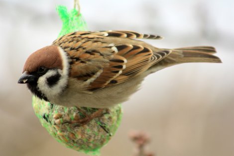 Ein Feldsperling bei der Winterfütterung (Foto: S. Klingner)
