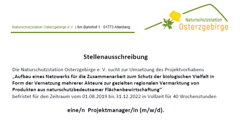 Unter Stellenangebote finden sie unsere aktuellen Stellenanzeigen. Derzeit gibt es die Möglichkeit sich als Regionalmanager sowie Flächenmanager in der Naturschutzstation und für die Umweltbildung im Botanischen Garten Schellerhau zu bewerben.