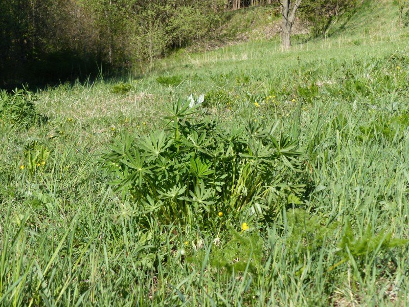 Auf der Wiese fühlen sich leider auch die Stauden-Lupinen sehr wohl. Die Ausbreitung dieses invasiven Neophyten ist eine ernst zu nehmende Gefahr für die mageren Bergwiesengesellschaften im Ostergebirge. Die Lupine bindet mit ihren Knöllchenbakterien den Stickstoff aus der Luft und macht ihn pflanzenverfügbar. Mit dieser Starthilfe bildet sie schon im Frühjahr so dichte Bestände, dass die typischen Bergwiesenarten verdrängt werden. Der zahlreiche und sehr langlebige Samen verschärft das Problem. Aus diesem Grund waren wir schon im Mai auf der Wiese unterwegs und haben mit Ampferstechern die Lupinen mit ihren langen Pfahlwurzeln ausgestochen und entsorgt. Diese effektive Methode werden wir im nächsten Jahr wiederholen und hoffen, dass so die ungehinderte Ausbreitung eingedämmt werden kann.