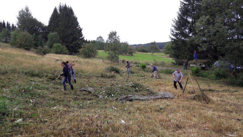 Die wieder aufgenommene naturschutzgerechte Pflege der „Wiese an der Bahnlinie“ durch die Naturschutzstation Osterzgebirge e.V. hat sich für den Arterhalt von Trollblume, Feuer-Lilie, Berg-Platterbse und Co. gelohnt. Die Wiese zeigte sich in diesem Jahr in einer besonders vielfältigen Blütenpracht und lockte zahlreiche Insekten, wie den Sumpfwiesen-Perlmuttfalter, die Spanische Flagge oder den Schwalbenschwanz an. Auch eine Kreuzotter konnte beim Sonnenbad beobachtet werden. Am letzten Augustwochenende mähten und beräumten wir wieder ein großes Teilstück der Fläche. Gefreut haben wir uns über die tatkräftige Unterstützung der freiwilligen Helfer aus dem Bärensteiner Bielatal. Ergänzt wird die diesjährige Wiesenmahd noch durch einen Einsatz von Schülern des Altenberger Gymnasiums, die sich in der Madagaskar-AG engagieren. Sie halfen bereits im vergangenen Jahr, die Standorte der Feuer-Lilien zu pflegen.