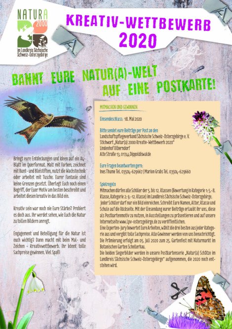 Der Landschaftspflegeverband Sächsische Schweiz-Osterzgebirge e.V. sucht für das Projekt "Natur(a) 2000" schöne Motive aus der heimischen Natur! Gestaltet ein Bild nach euren Wünschen - es werden Zeichnungen, Geschichten, Aktionen und Ideen rund um die Natur gesucht. Eurer Fantasie sind keine Grenzen gesetzt.