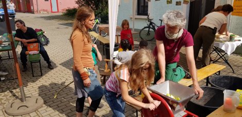 Am 28.9.2020 fuhr Jens Heinze vom Umweltbildungshaus Johannishöhe mit seiner Apfelsaftpresse im Gepäck nach Grumbach. Auf dem Schulgelände steht ein Apfelbaum, der jedes Jahr viel trägt.