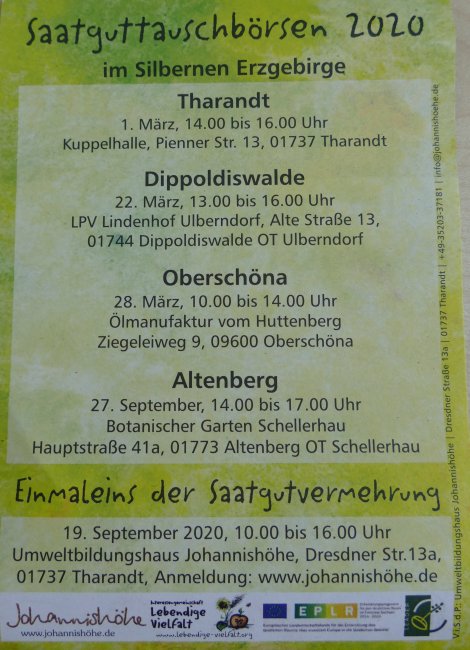 Im Silbernen Erzgebirge gehen drei Tauschbörsen an den Start; darunter sind der Lindenhof des LPV Ulberndorf bei Dippoldiswalde und die Öhlmanufaktur vom Huttenberg in Oberschöna im März, sowie der Botanische Garten Schellerhau bei Altenberg im September. Diese wurden im Rahmen des Leader-Projektes zur Erhaltung und Förderung von regionaler Kulturpflanzenvielfalt im Umweltbildungshaus Johannishöhe (Tharandt) organisiert.