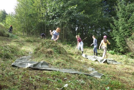 Kürzlich bekam die "Wiese an der Bahnlinie" in Altenberg einen frischen, naturschutzgerechten Schnitt. Ein motiviertes Team von Kindern und Jugendlichen aus dem regionalen Umkreis griff nach Rechen, Gabeln und Planen, um die Fläche zu beräumen. Um Balkenmäher und Motorsense etwas Vorlauf zu lassen, begann ein Teil der Gruppe damit, die nähere Umgebung zu erkunden und Tierspuren in Wald und Feld zu entdecken.