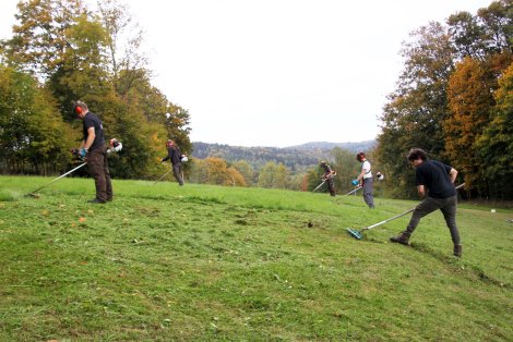 Bei herrlichem Herbstwetter schwärmten am zweiten Oktoberwochenende wieder Freiwillige auf die Wiesen um Oelsen aus: Am Sonnabend nahmen 15, am Sonntag acht gutgelaunte Teilnehmer Rechen und Mähgeräte in die Hand. Ehemalige und jetzige Studenten der Hochschule für Technik und Wirtschaft (HTW) aus Dresden waren darunter sowie ehrenamtliche Helfer aus den Reihen des Landesvereins Sächsischer Heimatschutz (LSH), eines Partner- und Gründungsvereins der Naturschutzstation.