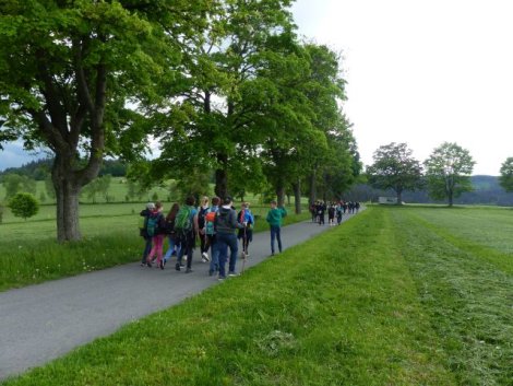 Damit sie den Sinn der Aktion verstehen, kam zusammen mit dem Klassenlehrer die Idee auf, zuvor einen Wandertag zur blühenden Wiese durchzuführen. Wir starteten Ende Mai: Nach der Einteilung in fünf Gruppen und Verteilung von Wanderaufgaben zogen wir los. Jede Gruppe war für einen Wegabschnitt mit Infopunkten zu den Themen Biologische Vielfalt, Schutzgebiete & geschützte Arten verantwortlich. Vier Kilometer und 270 Höhenmeter kämpften sich die Kinder bei sommerlichem Wetter den Hohen Brand hinauf. Zum Glück gab es viele Rastmöglichkeiten an kleinen Teichen und Aussichtspunkten.