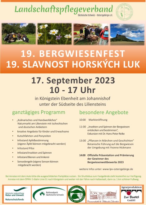 Das diesjährige Bergwiesenfest verspricht wieder ein buntes, regionales Treiben in Königstein/Ebenheit an der Südseite des Liliensteins zu werden. Kommen Sie vorbei! Ein Naturmarkt, Kulinarisches sowie Infostände aus vielen Naturbereichen erwarten Sie.