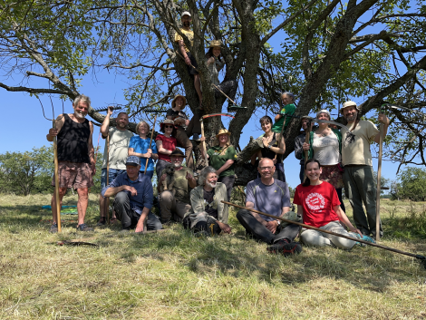 Gruppenbild mit Sensen: Teilnehmende des Heu(a)Hoj-Camps 2023 (Foto: J. Pollakis)