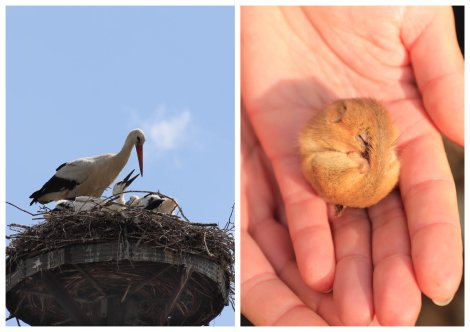 Weißstorch und Haselmaus sind zwei gegensätzliche Arten, die die Naturschutzstation Osterzgebirge "im Auge behält". (Fotos: S. Klingner)