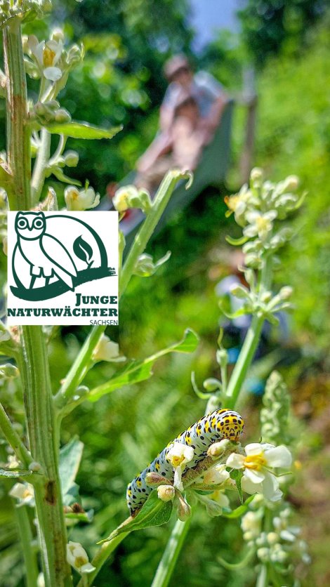 Entspannte Raupe und entspannte Kinder im Hintergrund: Das ArtenforscherInnen-Camp Schmetterlinge. (Foto: M. Müller)