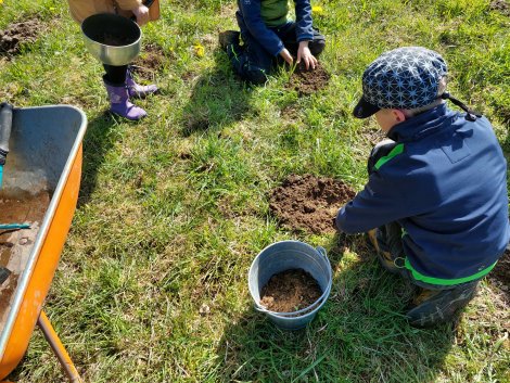 Kürzlich fand auf dem Permahof bei Hohnstein ein neuer Praxistag zum Thema „Boden und Gestein“ statt. Umweltbildner Frank erklärte uns - den Jungen Naturwächtern (JuNa) - zuerst, was wir vorhatten: den Boden von unterschiedlichen Standorten rund um den Permahof untersuchen und aus den gesammelten Schichten ein Regenwurmglas herstellen. So gingen wir eifrig mit dem benötigten Material wie Eimern, Spaten und Schaufeln raus auf die Weide. Dort holten wir die erste Bodenprobe. Schon hier begegneten uns interessante Tiere wie Rotmilane, ein Aurorafalter und ein Laubfrosch, zu denen Frank viel zu erzählen wusste.