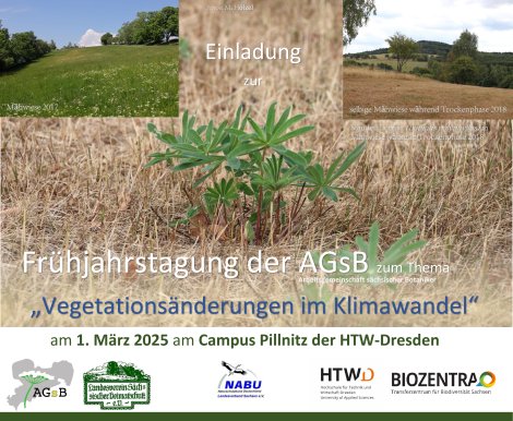 Die Arbeitsgemeinschaft, angesiedelt im Landesverein Sächsischer Heimatschutz, organisiert am 1. März ihre Frühjahrstagung - alle Interessierten sich herzlich eingeladen. Wer dabei sein möchte, wird gebeten, sich unbedingt bis zum 20.2. anzumelden. Im Kontext des übergreifenden Themas werden verschiedenste Vorträge geboten - unter anderem zum botanischen Naturschutz, zu Kryptogamen, Pfeifengraswiesen und weiteren. Das komplette Programm der Tagung sowie weitere Einzelheiten finden sich in dieser Programmankündigung.